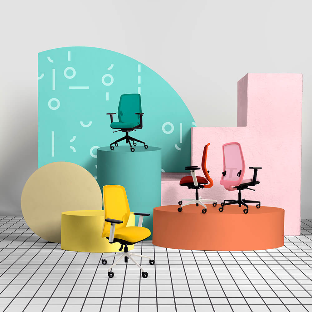 De aluminio pulido o aluminio pintado en negro. Reposabrazos de nylon negro o blanco según base.