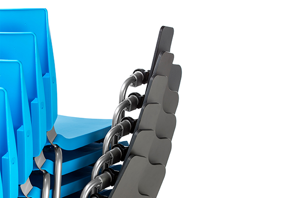 Inyección plástica de polipropileno de 7 mm de grosor, 100% reciclable. Unión entre asiento y respaldo por medio de dos piezas trapezoidales soldada a la estructura.